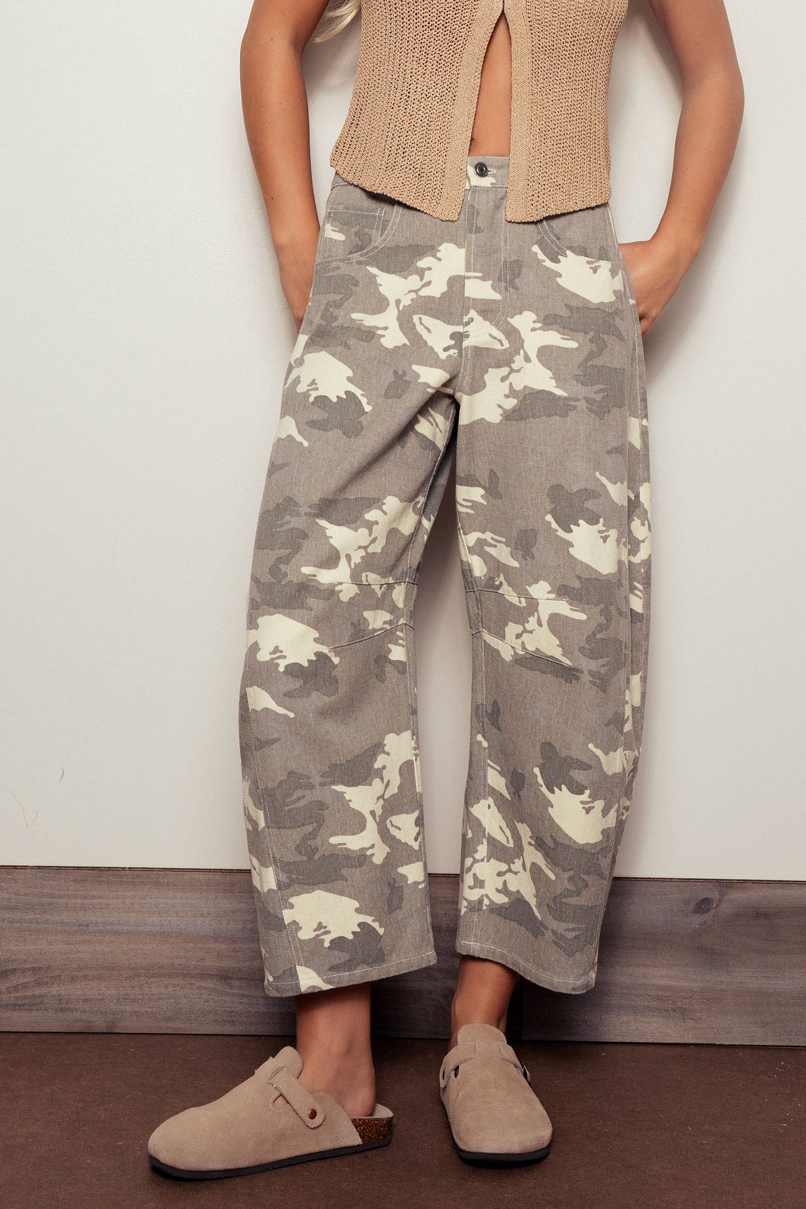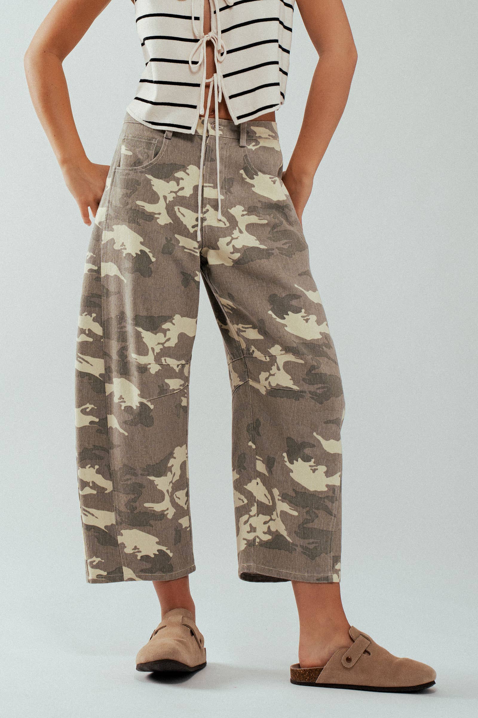 Blend boho and western style with these relaxed, wide leg camo print jeans. Crafted from 100% cotton denim, they feature a cropped, ankle-grazing fit—perfect for pairing with summer tops or graphic tees for standout women’s clothing.