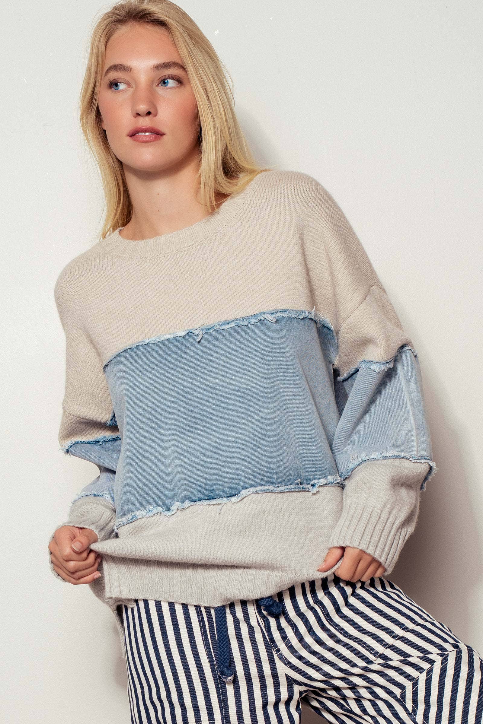 Colorblock Distressed Denim Patchwork Knit Sweater