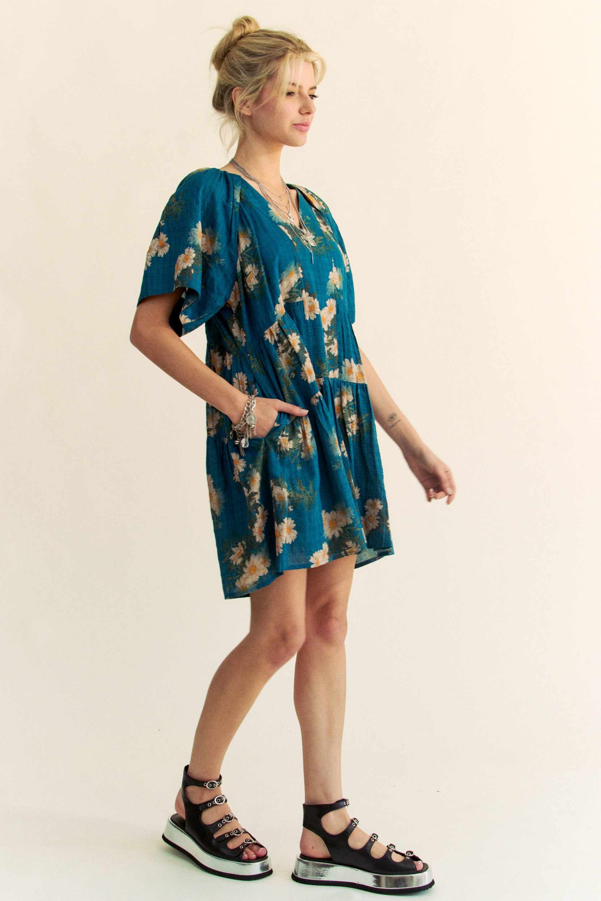 Davi & Dani - FLORAL PRINT SHORT BELL SLEEVE PLEATED MINI DRESS