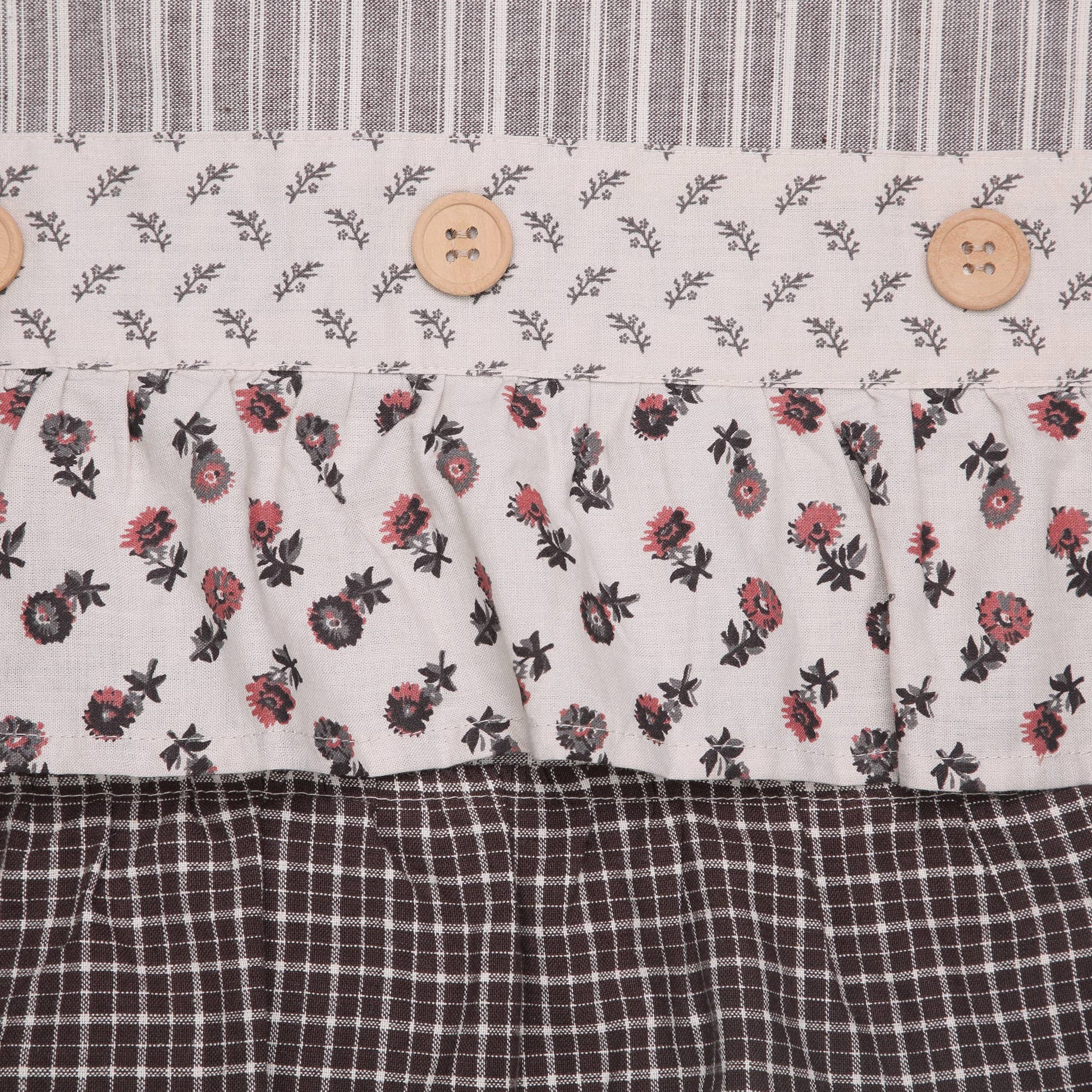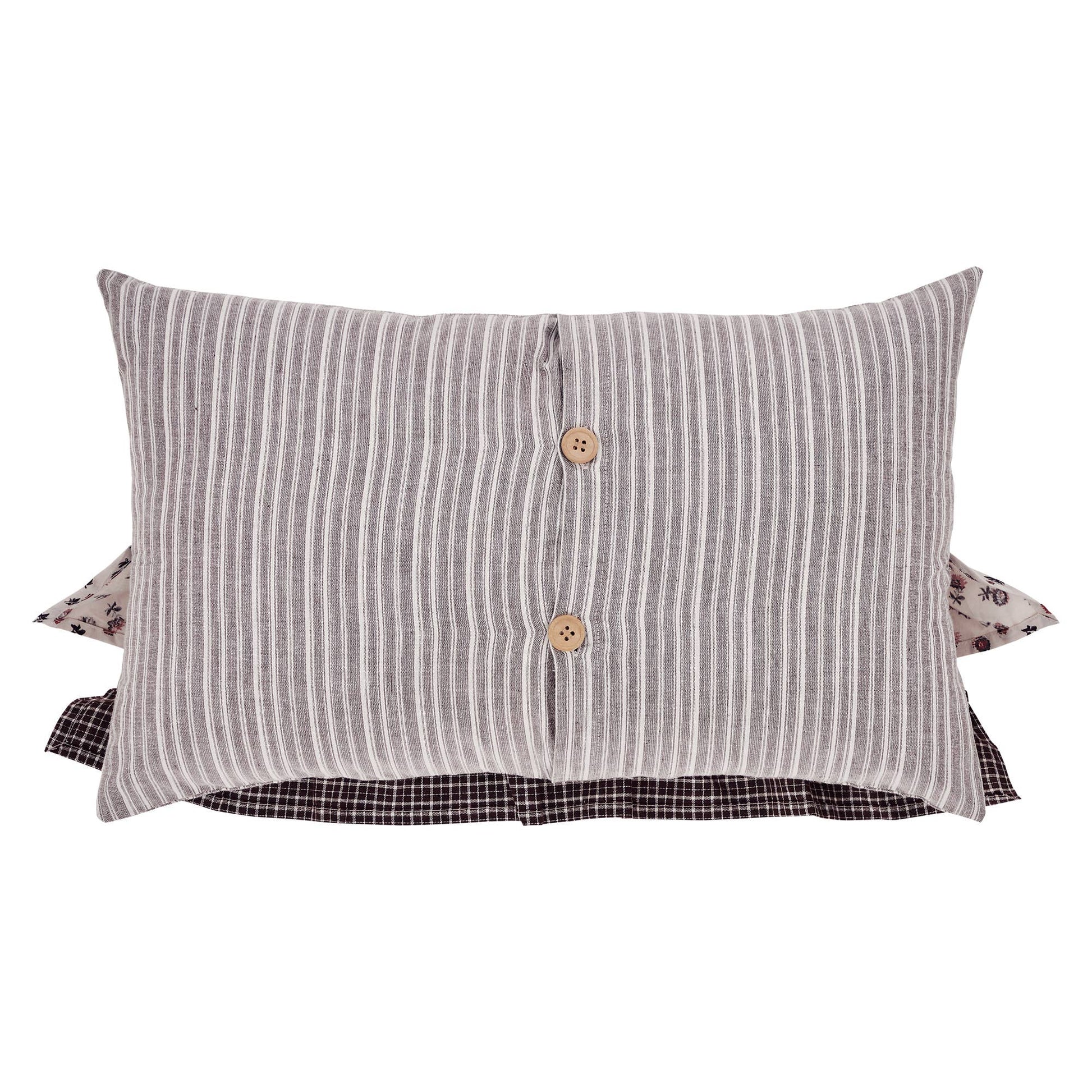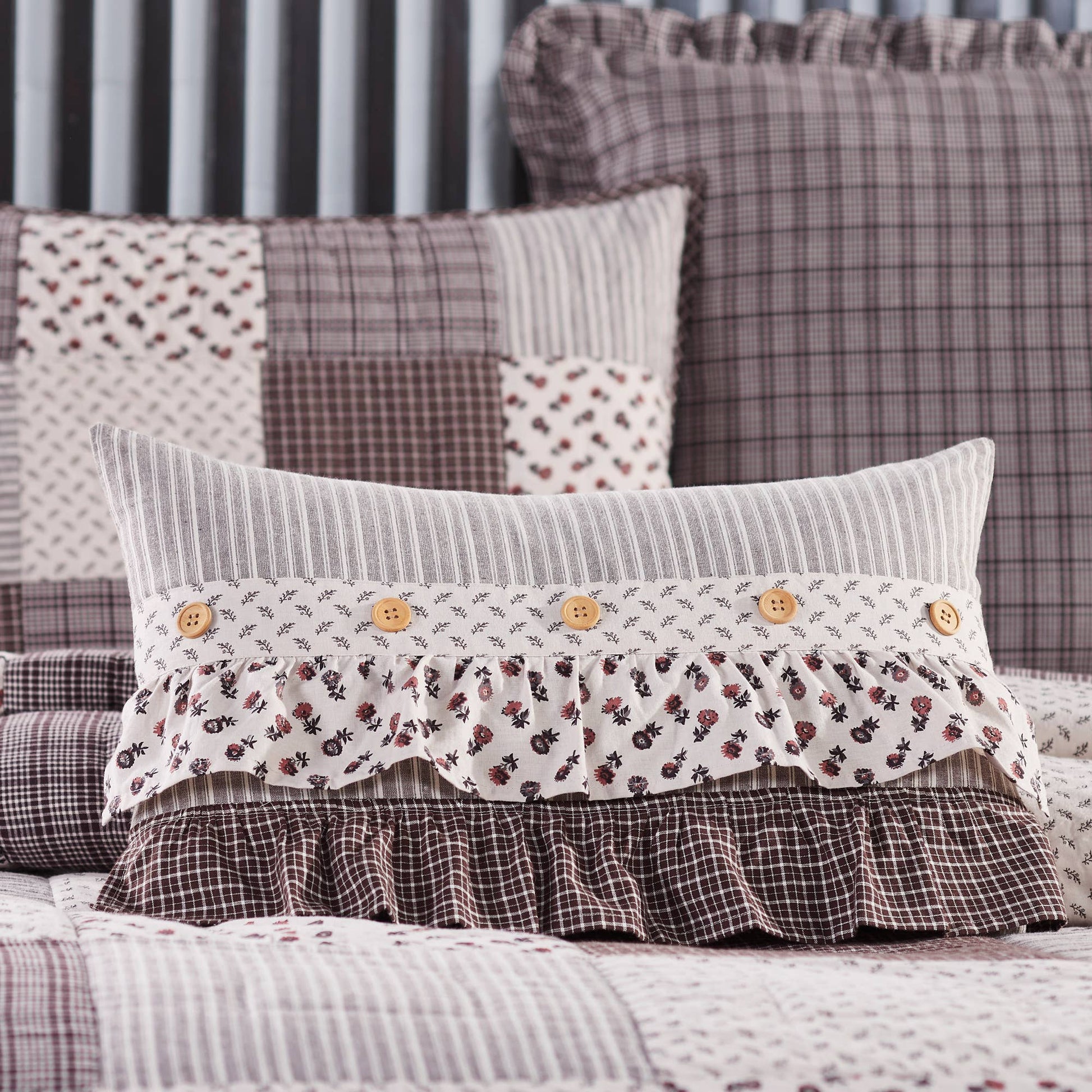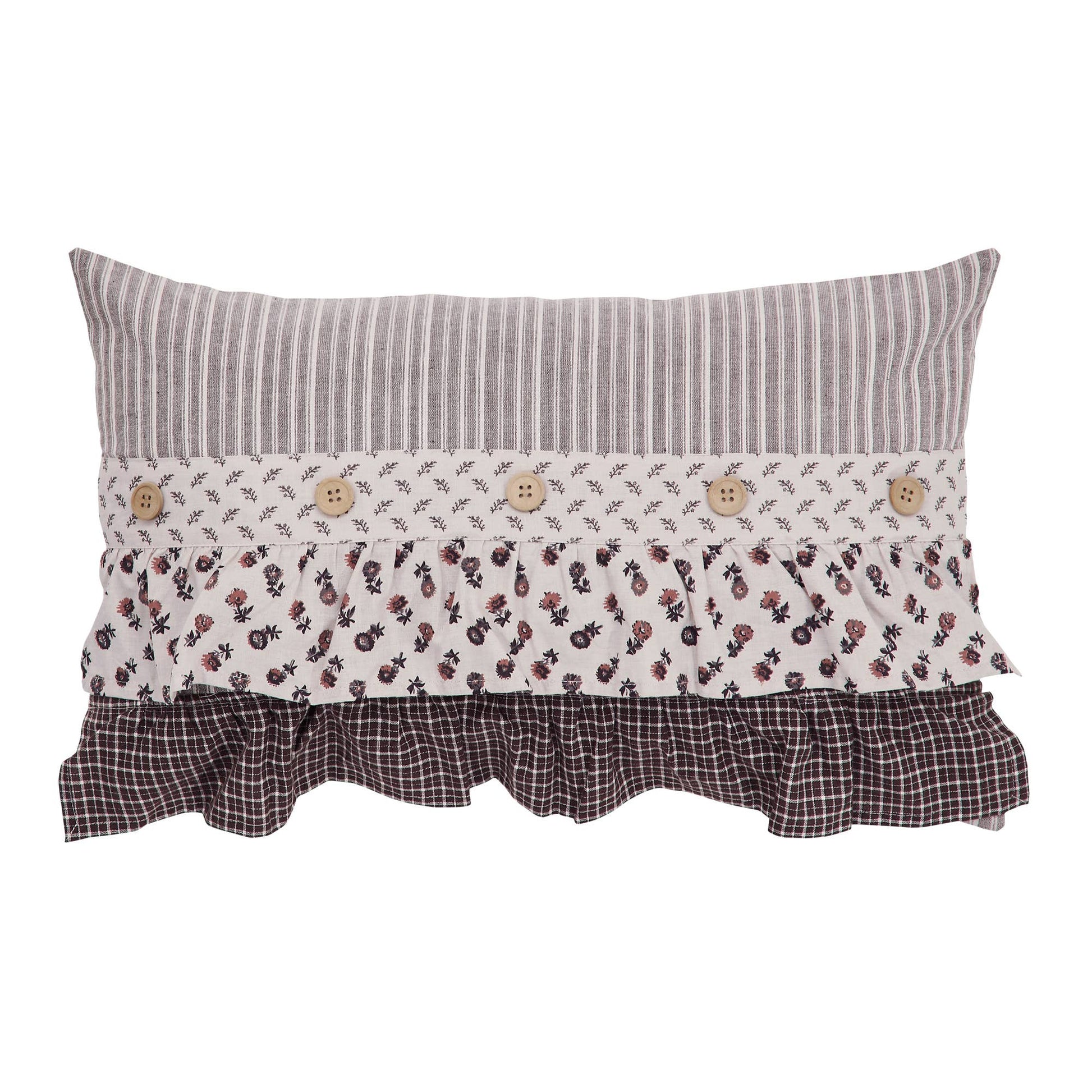 Romantic ruffles in warm, vintage patterns create a chic cottage accent piece that adds elegance to any cozy chair or humble welcome bench. The Florette Ruffled Pillow measures 14x22 inches and includes a striped base in soft taupe and creme. A wide band of contrasting floral fabric accented with decorative buttons anchors a ruffled detail in vintage ditsy floral over a second layer of coffee-toned microcheck. Reverses to button-style closures for easy cleaning. Constructed from 100 percent cotton with a polyester fill. Machine washable and iron safe. Coordinates with the Florette Collection from VHC for accent and foundational pieces in a romantic vintage farmhouse style with the quality you would expect from over 20 years of satisfied customers.