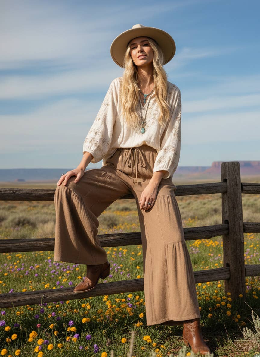 Effortless and lightweight, these wide leg pants are made from a soft linen-rayon blend for a naturally airy feel. The relaxed, flowy silhouette features a tiered design and an elastic drawstring waistband for an easy, comfortable fit. Perfect for warm weather styling, they pair beautifully with boho blouses or simple tanks for an elevated casual look that moves with ease.linen pants, rayon blend, wide leg, tiered pants, drawstring waist, boho chic, breathable fabric, lightweight bottoms, casual style, summer outfit, relaxed fit, soft texture, everyday wear, easy flow