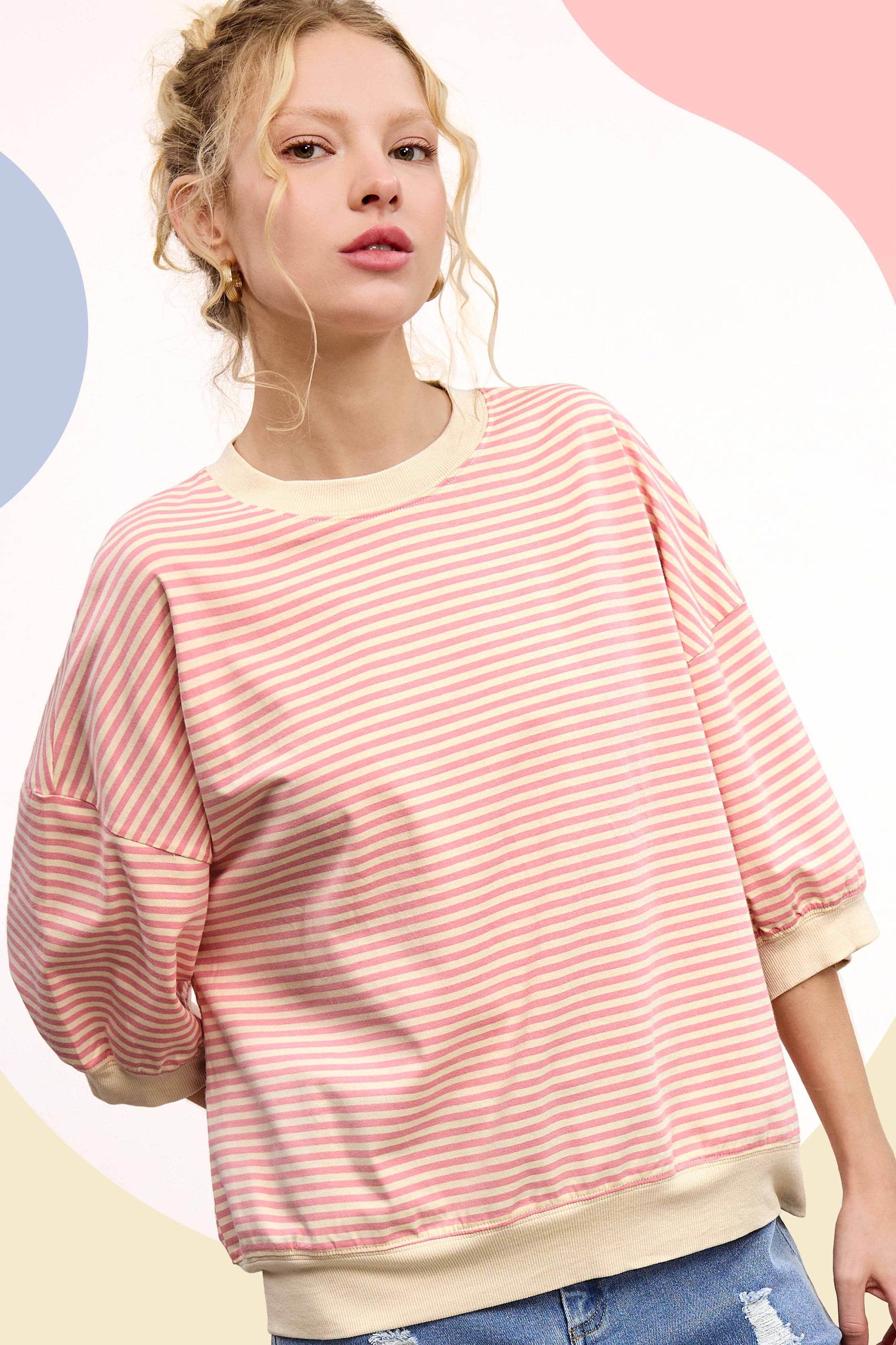 So cool and classic, this timeless crewneck top is featured in an oversized, slouchy silhouette and staple striped print. Lovely for layering or styling solo. Loose fit makes this perfect style for a loungewear too. (Long sleeve version: MCT7678) Perfect with your favorite bottom and shoes for a variety look this season.