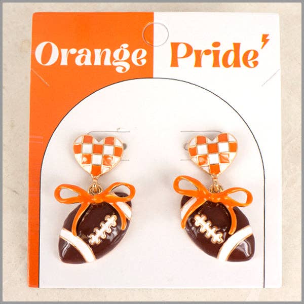 Orange and White Color Coated Heart with Bow & Football Gameday Stud 1.5" Earring