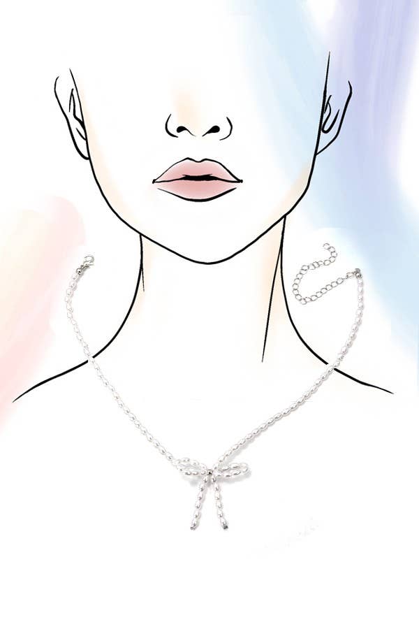 Pearl Bead Bow Ribbon Necklace, a graceful blend of sophistication and charm.