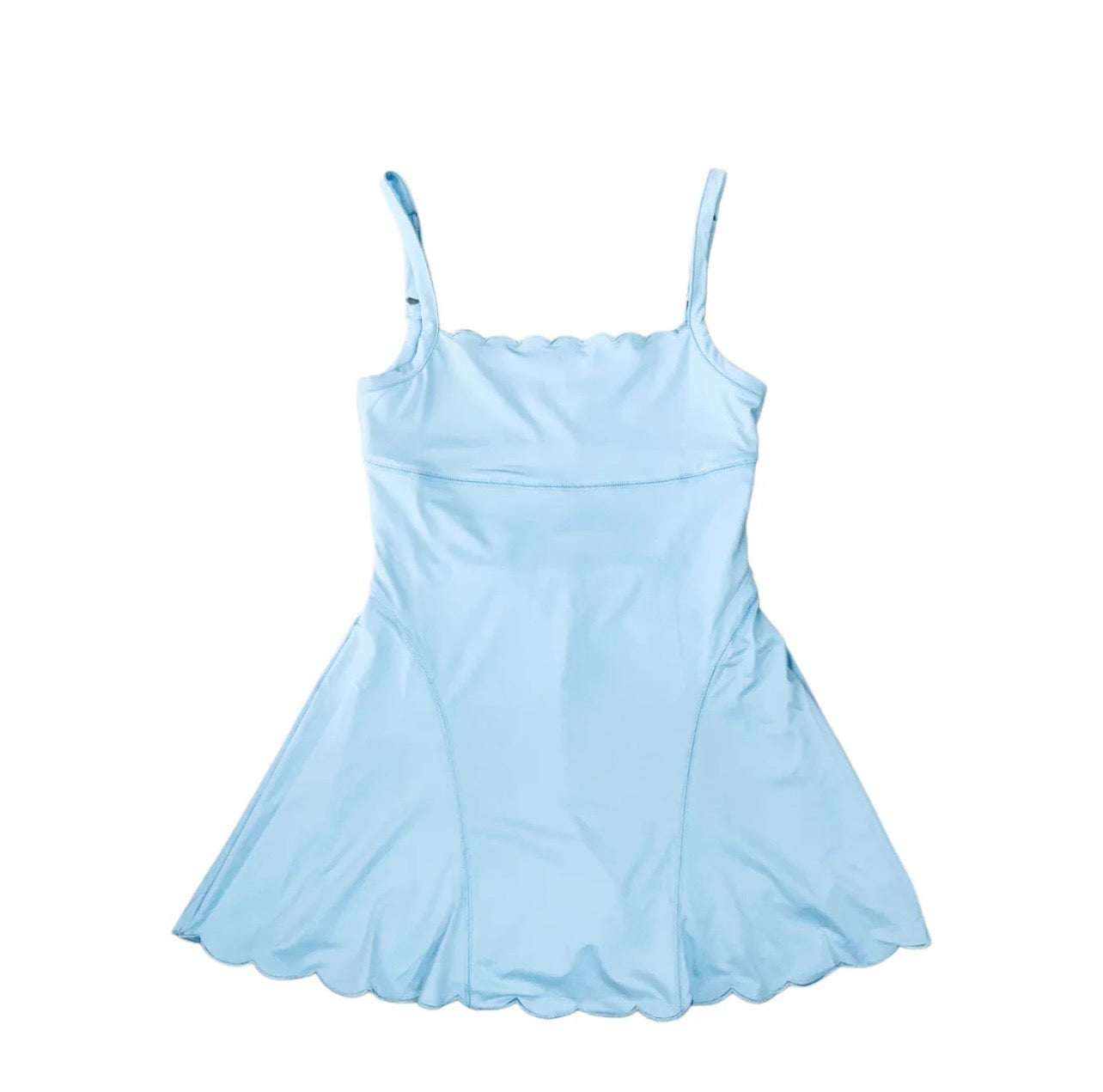 Pink dress with scallop detailing. Transition from gym to street. Built in shorts