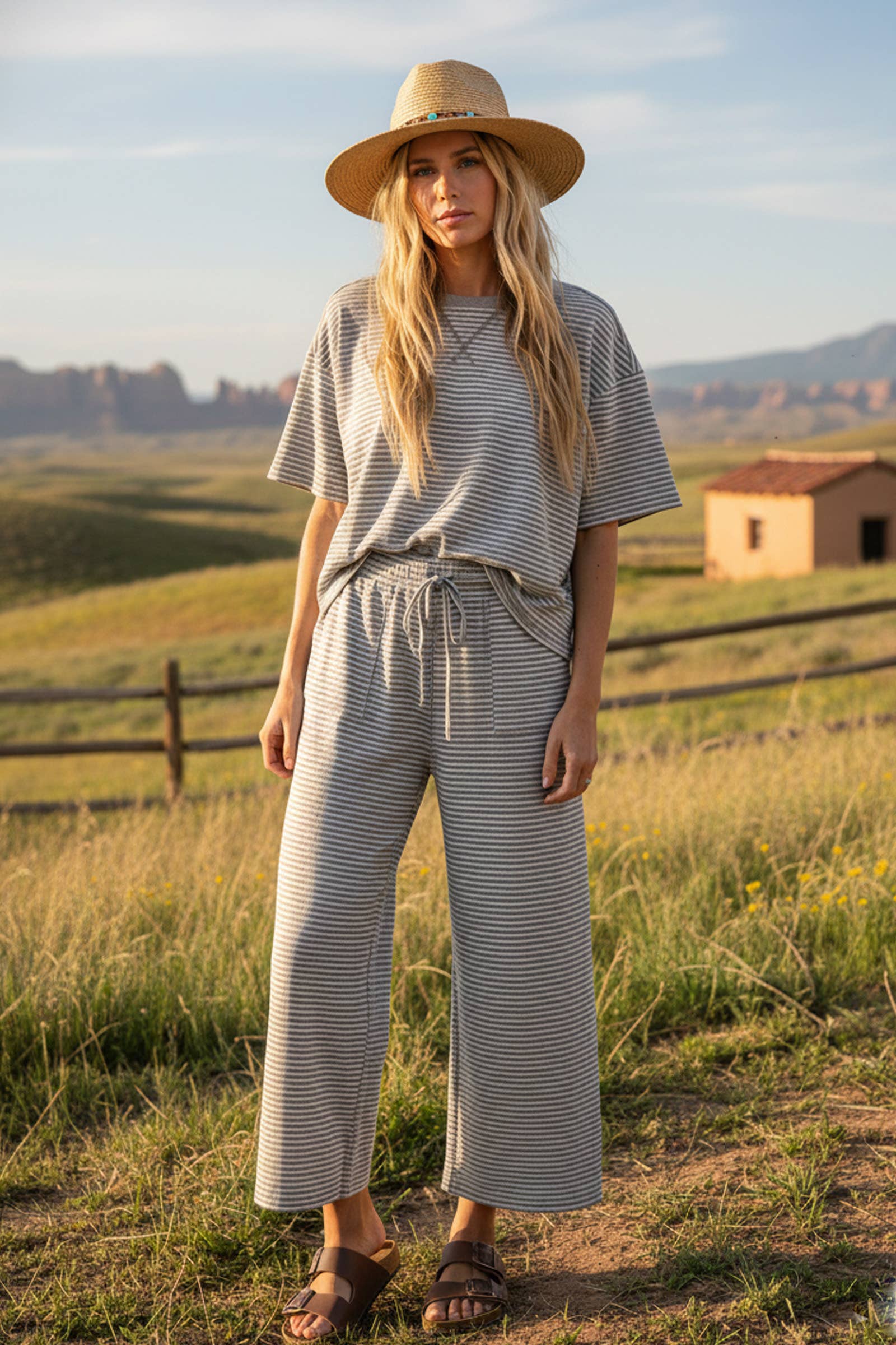A comfy and stylish striped knit set featuring a relaxed short-sleeve top and matching wide-leg pants. Designed in a soft, cool-touch ribbed fabric, this set offers breathable comfort and effortless movement. The top has a loose, oversized fit, while the pants feature an elastic drawstring waistband and practical side pockets. Perfect for lounging, traveling, or casual days out.striped knit set, lounge set, relaxed fit, short sleeve top, drawstring pants, comfy outfit, soft ribbed fabric, matching set, boho lounge wear, Free People style, travel set, weekend outfit, lightweight knit