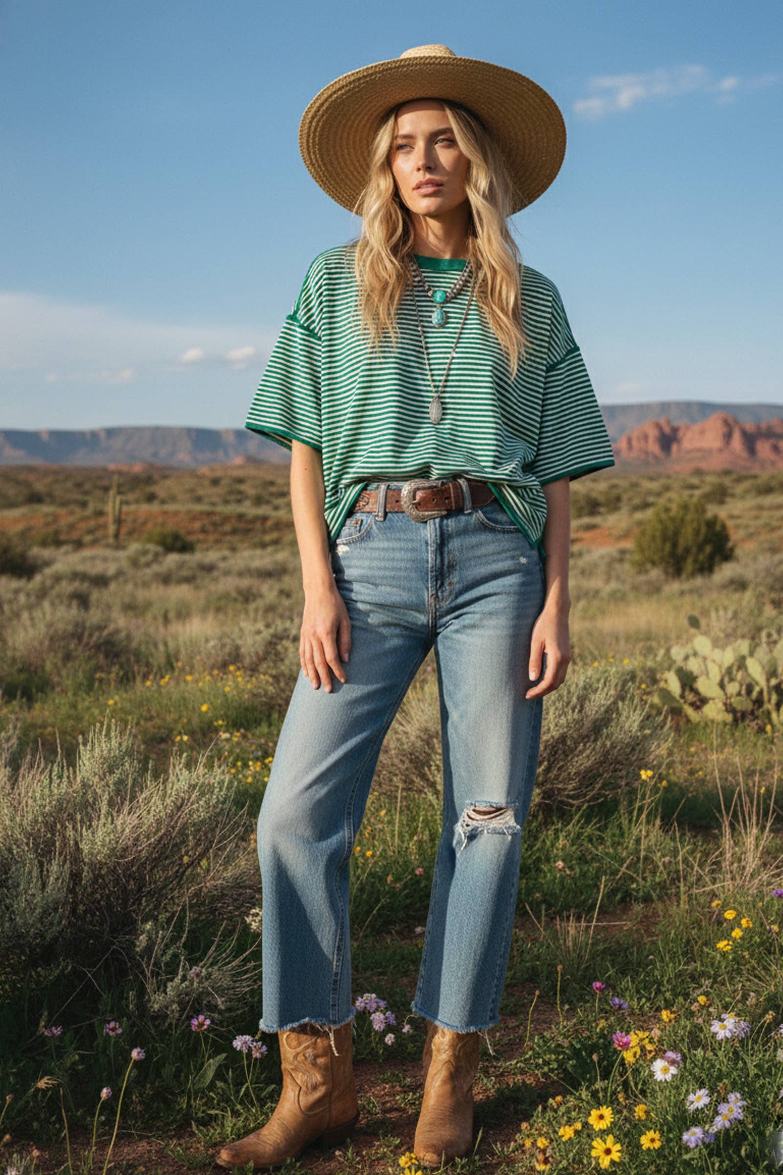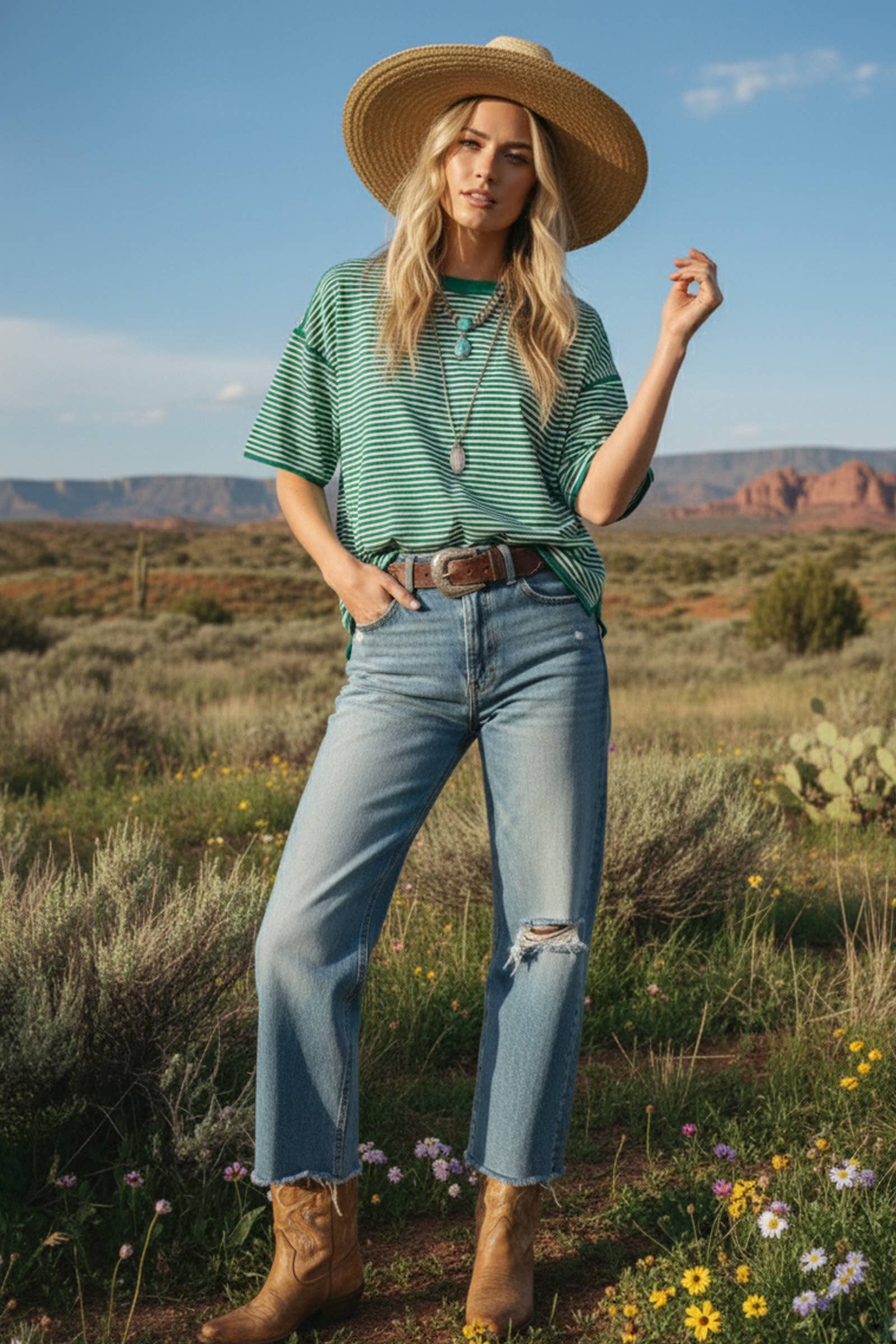A relaxed and effortlessly chic striped knit top featuring a boxy oversized fit and drop shoulder sleeves for a laid-back, boho look. Made from soft, breathable fabric, it's perfect for pairing with denim shorts or casual pants. The wide crew neckline and clean hem make it easy to style tucked in or loose for an easygoing everyday outfit. striped top, oversized tee, relaxed fit, knit top, casual wear, boho chic, wide sleeve top, breathable fabric, Free People style, weekend outfit, everyday top, soft knit, lightweight stripes