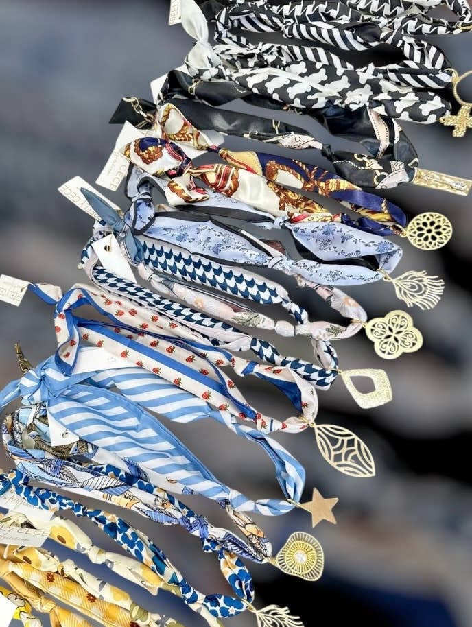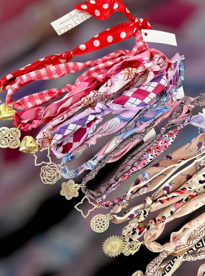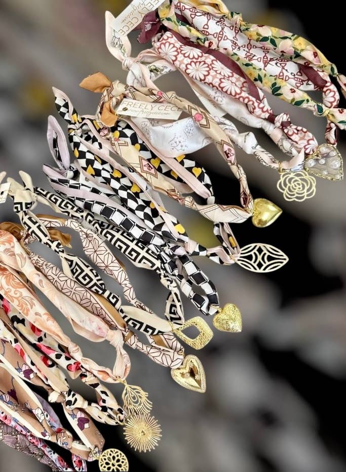 These necklaces are so fun! Each one is a beautiful fabric print adorned with a statement charm. Each necklace is a random array of scarfs in multiple prints with an assorted charm.